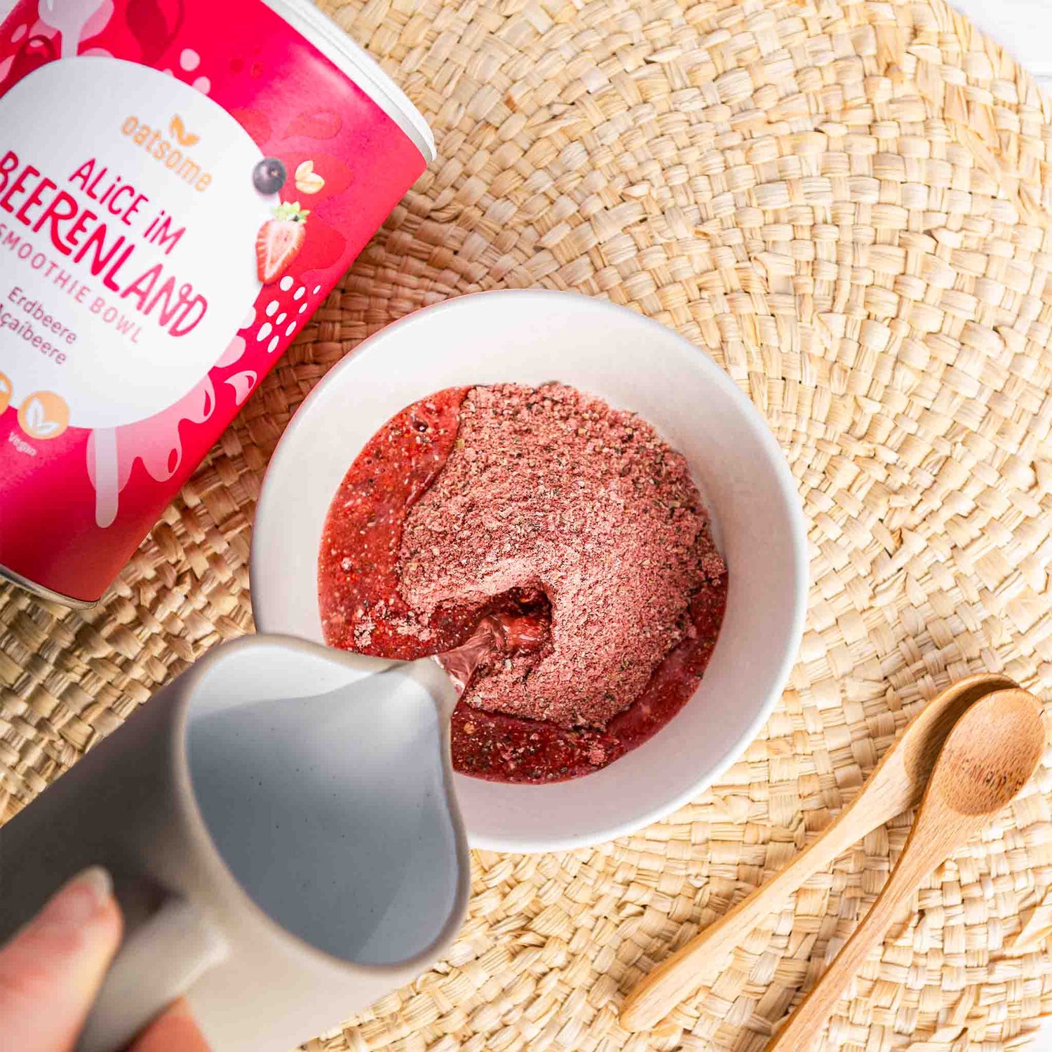 Füge die angegebene Menge Wasser, Pflanzendrink oder Milch deiner Wahl hinzu.