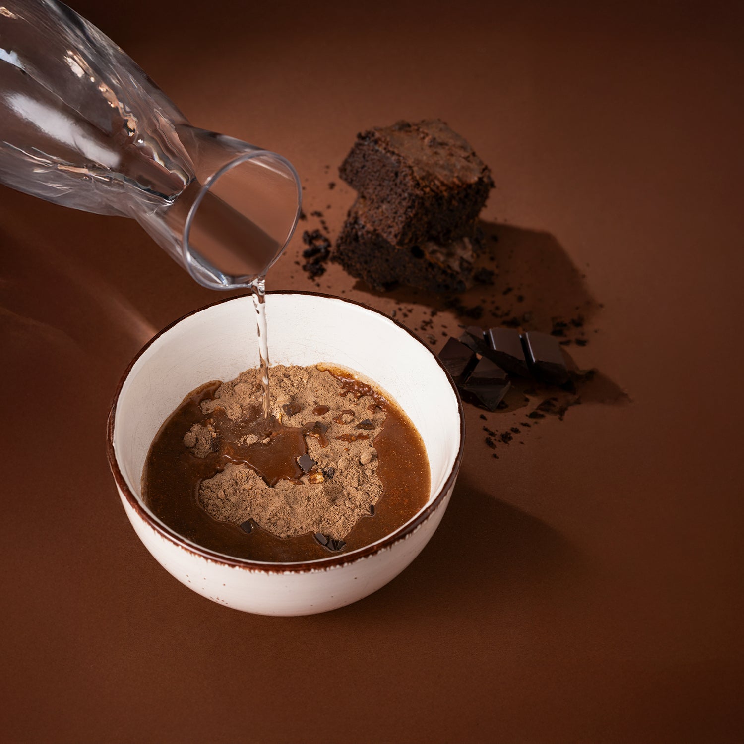Trockenmischung aus Getreide und Proteinmehlen mit Bitterschokolade (Kakao: 67% mindestens im Schokoladenanteil).