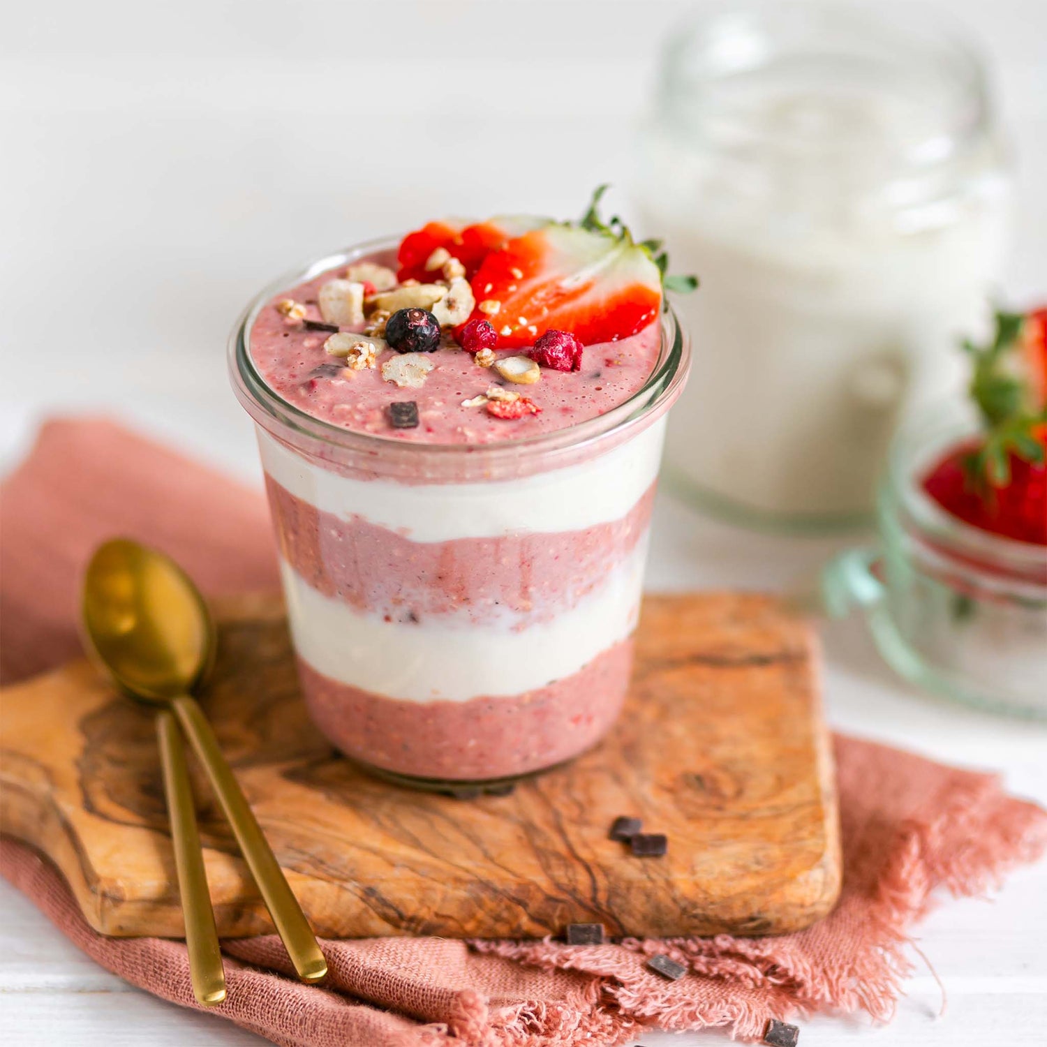 Trockenmischung aus Getreide und Haferprotein mit Erdbeere, fermentiertem Haferdrinkpulver und Bitterschokolade. (Kakao: 67% mindestens im Schokoladenanteil)