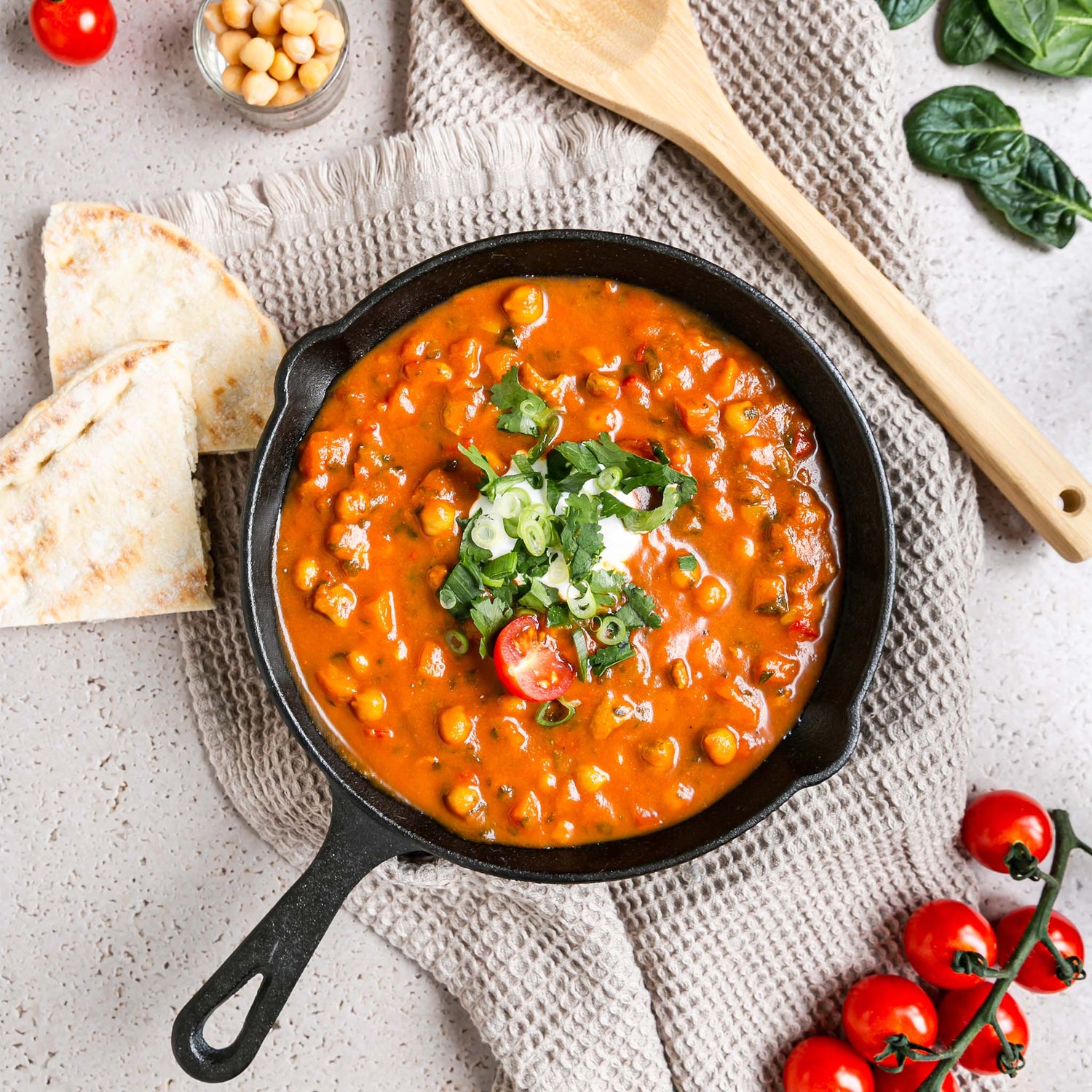 Tomaten, Kichererbsen und eine Ladung Gewürze – klingt simpel, schmeckt aber wie eine Offenbarung. Fruchtige Tomaten treffen auf eine perfekt abgestimmte Curry-Würzung und sorgen für eine Geschmacksexplosion, die du so schnell nicht vergisst. Knackige Kichererbsen halten dich lange satt und versorgen dich mit der richtigen Portion Proteine.